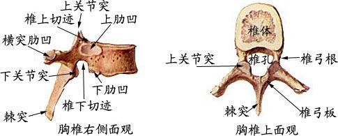2)胸椎特点:①胸椎体上和横突上有与肋相连结的肋凹。②棘突向后下斜伸呈叠瓦状。