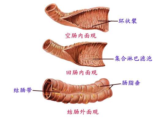 大肠起自回肠,终于肛门。约1.5米,呈“门框”状包绕在小肠周围。分为盲肠、结肠、直肠三部。盲肠和结肠表面有三个特征性的结构,即:结肠带、结肠袋、肠脂垂。结肠带共三条,交汇于阑尾根部。