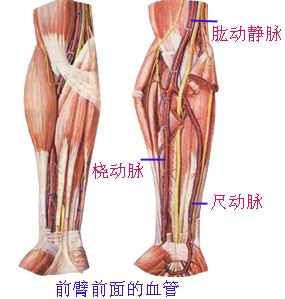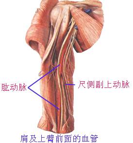 (2)肱动脉:为腋动脉的延续,在肱二头肌内侧下降至肘窝,分为尺动脉和桡动脉。