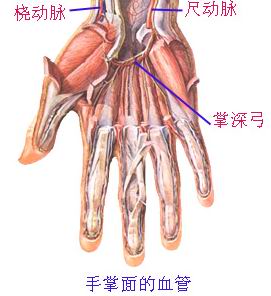 2)掌深弓:位置较深,由桡动脉的终支和尺动脉的掌深支吻合而成。