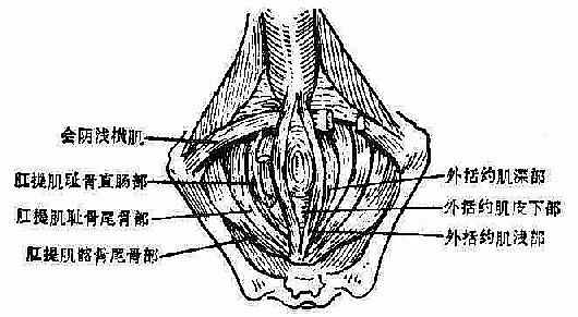 肌肉 该区有肛门外括约肌、肛门内括约肌、肛提肌和纵形肌。肛门外括约肌是随意肌,有括约功能,它由三组,即皮下部,浅部和深部。皮下部系狭小环形肌束,在肛周皮下,手术切断不会引起大便失禁;浅部在皮下部和深部之间,是椭圆形肌束,起自尾骨,向前围绕肛管两侧而止于会阴体;深部在浅部之上外侧,系环状肌束,在围绕内括约肌的周围(图2-98)。肛门内括约肌是不随意肌,长约3cm,围绕肛管的上2/3,系直肠环肌肥大增厚部分。有帮助排便,但无括约功能。肛提肌是随意,在直肠周围形成盘底的一层宽薄的肌肉,由耻骨直肠肌,耻骨尾骨肌和髂骨尾骨肌三部分组成。耻骨直肠肌部分与肛门外括约肌后部合并,共起肛管括约功能。直肠纵肌向下围绕肛管上部,组成肛管直肠环。有感染时,可沿间隔蔓延,发生脓肿或瘘管。