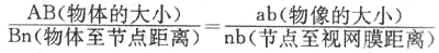 图9-4 简化眼及其成像情况 n为节点,AnB和anb是两个相似三角形;如果物距为已知,就可由物体大小算出物像 大小,也可算出两三角形对顶角(即视角)的大小 利用简化眼可以方便地计算出不远近的物体在视网膜上成像的大小。如图9-4所示,AnB和and是具有对顶角的两个相似的三角形,因而有: