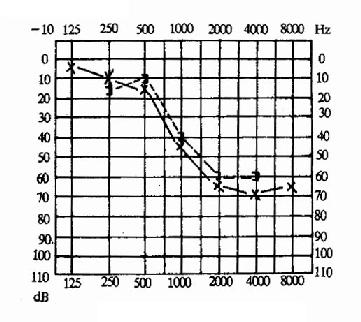 ③混合性聋(图2-27):骨导曲线下降,气导曲线又低于骨导曲线。