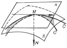 [测地曲率与贝尔特拉米公式]  M为曲面S上一点,CS上通过点M的一条曲线,SM的切面,C上的正射影,则M的曲率称为CM的测地曲率,记作.
