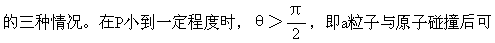 式中Ma粒子的质量,重金属原子核的质量和a粒子的质量相比较,可以看作是无穷大。由上式可知,“瞄准”距离P愈小,偏转角θ愈大。对于不同的“瞄准”距离,a粒子的轨道形状可有如图5-2所示