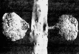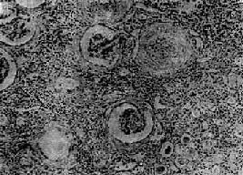 图12-24 慢性肾盂肾炎 两侧肾不对称,体积皆缩小,表面颗粒状,有不规则的瘢痕 镜下见病变呈不规则片状,夹杂于相对正常的肾组织之间。瘢痕区的肾组织破坏,肾间质和肾盂粘膜纤维组织大量增生,其中有大量淋巴细胞、浆细胞、单核细胞和多少不等的中性粒细胞浸润。其间的小血管常有炎症,管壁增厚,管腔狭小。肾小管多萎缩、坏死由纤维组织替代。有些肾小管腔扩张,腔内有均匀红染的胶样管型,形似甲状腺滤泡。有些肾小管腔内还有多数中性粒细胞。肾小球多萎缩、纤维化或玻璃样变(图12-25)。病灶周围的肾组织内肾小球尚完好,有些肾小球的球囊壁增厚,纤维化。有些肾单位呈代偿性肥大。