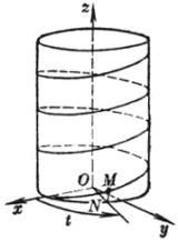 [圆柱螺旋线] 一动点绕一直线作等速转动,并沿这直线作等速移动,则称这个动点的轨迹为圆柱螺旋线(图7.19),其参数方程为