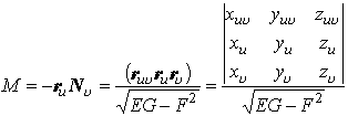 式中偏导数等在点取值,EFG为第一基本量,N为曲面在点M的法线单位矢量。