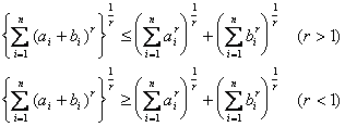 [闵可夫斯基不等式] 设ai, bi>0 (i=1, 2, L, n),又r>0, r¹1, 则
