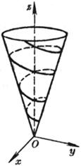 [圆锥螺旋线]     与一圆锥面母线的交角为定角的曲线称为圆锥螺旋线(图7.20),其方程为