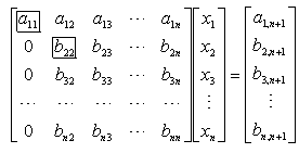 [无回代过程的主元素消去法] 这种方法与上法基本一样,不同之处在于每次消元时,都用某一方程去消去其余所有n-1个方程的未知数,例如上面方法的消元步骤(2)中,改成将第二个方程乘以分别与第i个方程相加,i=1,3,4,...,n(共n-1个,与上面方法不同的是,这里包括i=1,并设a12=b12),得到新的系数矩阵是