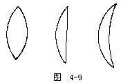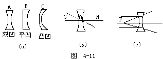 【凹透镜】 两侧面均为球面或一侧是球面另一侧是平面的透明体,中间部分较薄,称为四透镜。分为双凹、平凹及凸凹透镜三种,如图411a所示之ABC。其两面曲率中心之连线图411b所示之G1H,称为主轴,其中央之点O称为光心。通过光心的光线,无论来自何方均不折射。图411c表示,平行主轴之光束,照于凹透镜上折射后向四方发散,逆其发散方向的延长线,则均会于与光源同侧之一点F,其折射光线恰如从F点发出,此点称为虚焦点。在透镜两侧各有一个。凹透镜又称为发散透镜。四透镜的焦距,如图4-12所示。是指由焦点到透镜中心的距离。透镜的球面曲率半径越大其焦距越长,如为薄透镜,则其两侧之焦距相等。