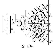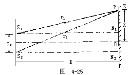 涉条纹如图4-24所示,它是以P0点为对称点而明暗相间的条纹。P0点处的中央条纹是明条纹。当用不同的单色光源作实验时,各明暗条纹的间距并不相同。波长较短的单色光如紫光,条纹较密;波长较长的单色光如红光,条纹较稀。另外,如果用白光作实验,在屏幕上只有中央条纹是白色的。在中央白色条纹的两侧,由于各单色光的明暗条纹的位置不同,形成由紫而红的彩色条纹。干涉明暗条纹的条件由图4-25所示,设相干光源S1S2之间的距离为2a,到屏幕E的距离为D,已知D>>2a。在屏幕上任取一点PPS1S2的距离分别为r1r2。从S1S2所发出的光,到P点处的光程差是: