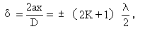 这里K=0相应于在O点处的中央明条纹。K=1K=2,…等等相应的明条纹分别称为第一级、第二级、…明条纹。如果P点为暗点,按干涉条件,有