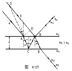 【薄膜干涉】水面上的薄层油膜,机动车在潮湿柏油道上所遗留下来的油迹,或是肥皂泡等,都会在白光中出现灿烂的彩色。所有上述的各例中,均是由薄膜干涉现象引起的。若将一用金属细丝制成的矩形框架,浸以肥皂水形成一层薄膜,然后用弧光灯的白光或阳光照射于其上,就呈现出典型的薄膜干涉。其中一部分是由反射光产生的干涉条纹,而其余的则从皂液膜中透过去。此时从反射光中可以看到许多与水平框架上缘平行的彩色横条纹。不但如此,这些横条纹还会慢慢地向下移动,愈靠近框架上缘则愈宽。此外,透射光在白幕上也显示出许多彩色横条纹,但比起反射光中的条纹要暗淡得多。如果用单色光代替白光,则彩色现象会立即消失,而出现的便是一些彩色条纹的花样类似于明暗相间的条纹。在1800年英国科学家杨格指出薄膜彩色条纹之形成,是因为干涉现象所致。如图4-26SA是一束单色光,斜射到厚度为d之皂液薄膜P1P2上。照射于A处之光线S(实际上它代表的是一个光束),一部分立即被反射,而另一部分则折射到B处。反射部分以S1来表示,折射至B处者又会照样地有一部分立即被反射,及另一部分被折射。后者仍用S3来表示。被反射的光线抵达C处,又在该处分为两部分,一部分折射为平行于S1S2,另一部分被反射后则沿CD路线而抵达D处。然后再在该处被分为两部分,一部分折射为平行于S3S4,另一部分则被反射到E处。关于薄膜上所发生之干涉现象(单色光),如果有两条平行入射到薄膜上,如图4-27中的abb在薄膜上表面的反射光线为b1a由膜的上表面折射到下表面的C点再反射到B点,又折回a1b1重合。我们可以计算出aa1bb1之间的光程差。对薄膜来说,AB的长度比光源S到薄膜的距离小得很多,因此∠BSA非常小,可以认为SASB是相互平行的。作ADSB,可以认为SA=SD,也就是说从S发出的这两条光线分别到达A点和D点时,光程是相等的。从图中可以看出,光线a在薄膜(折射率为n2)中经历路程ACB到达B点,而光线b在原媒质(折射率n1n2)中经历路程DB而在B点反射。所以这两光线之间的光程差