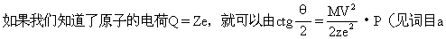 a粒子的散射】 1911年卢瑟福等人用a粒子(He的原子核)射击重的金属箔,结果大部分a粒子穿过了金属箔而很少改变其运动方向,一少部分a粒子被分别散射到不同的方向上。他们测定了不同散射角中a粒子的数目,加以分析后,得出如下结论:原子是由一个很小的核心(原子核)和围绕着它运动的电子构成(原子行星模型),原子核所带电荷量为ZeZ为该金属的原子序数,e为电子的电荷),其线度约为原子的十万分之一,一般为10-1310-12厘米,a粒子散射,又称为卢瑟福散射,它是原子物理发展中最早期的重要实验之一。图5-1所示描述了a粒子通过重金属箔的散射情况。假设距原子核很远的地方,a粒子沿直线ab以速度V运动,以P表示直线ab与原子中心O(即原子的正电荷E所在的地方)的最短距离。P被称为“瞄准”距离,可由理论力学应用电学知识计算证明,在a粒子与电荷E之间存在着库仑相互作用力的情况下,a粒子沿双曲线运动。而a粒子轨道的偏转角θ(双曲线的渐近线之间的角)为下式决定: