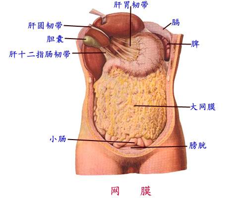 是连于胃大弯和横结肠之间的四层腹膜。 Is connected between the greater curvature of the stomach and transverse colon four peritoneum. 呈“围裙”状悬挂于横结肠和小肠之前。 Was "apron" shape before hanging in the transverse colon and small intestine. 大网膜内含脂肪、血管、淋巴管等,活动度大,有限制炎症蔓延的作用。 Omentum contains fat, blood vessels, lymphatic vessels, etc., activity, and have a role in limiting the spread of inflammation.