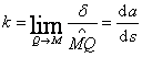 The ratio between the angle d and the arc length between the positive tangents of two points M and Q on the curve , when Q tends to M , the limit , namely![]()